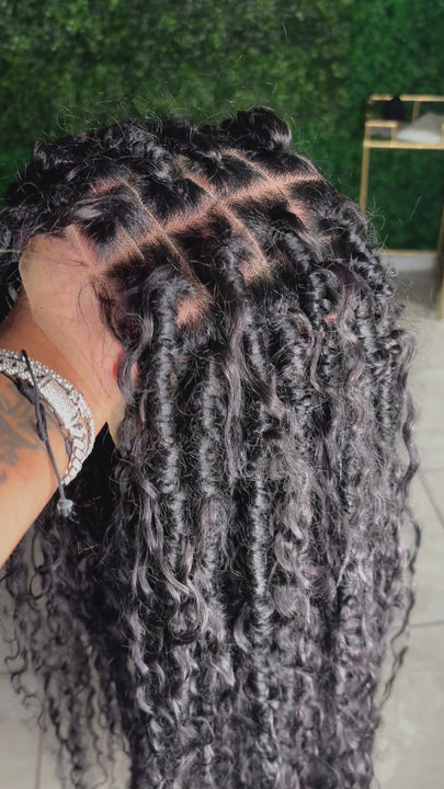 Our Gypsy Locs Full Lace Synthetic-Based Wig is a stunning, high-quality unit designed for those who love the beauty of gypsy locs with the convenience of a synthetic base. This unit combines the best of both worlds—a full lace synthetic base for longevity and structure, while incorporating 3-4 bundles of virgin deep wave human hair strands (26-28 inches) for a flawless, natural look. The baby hairs are also made from human hair for seamless styling.